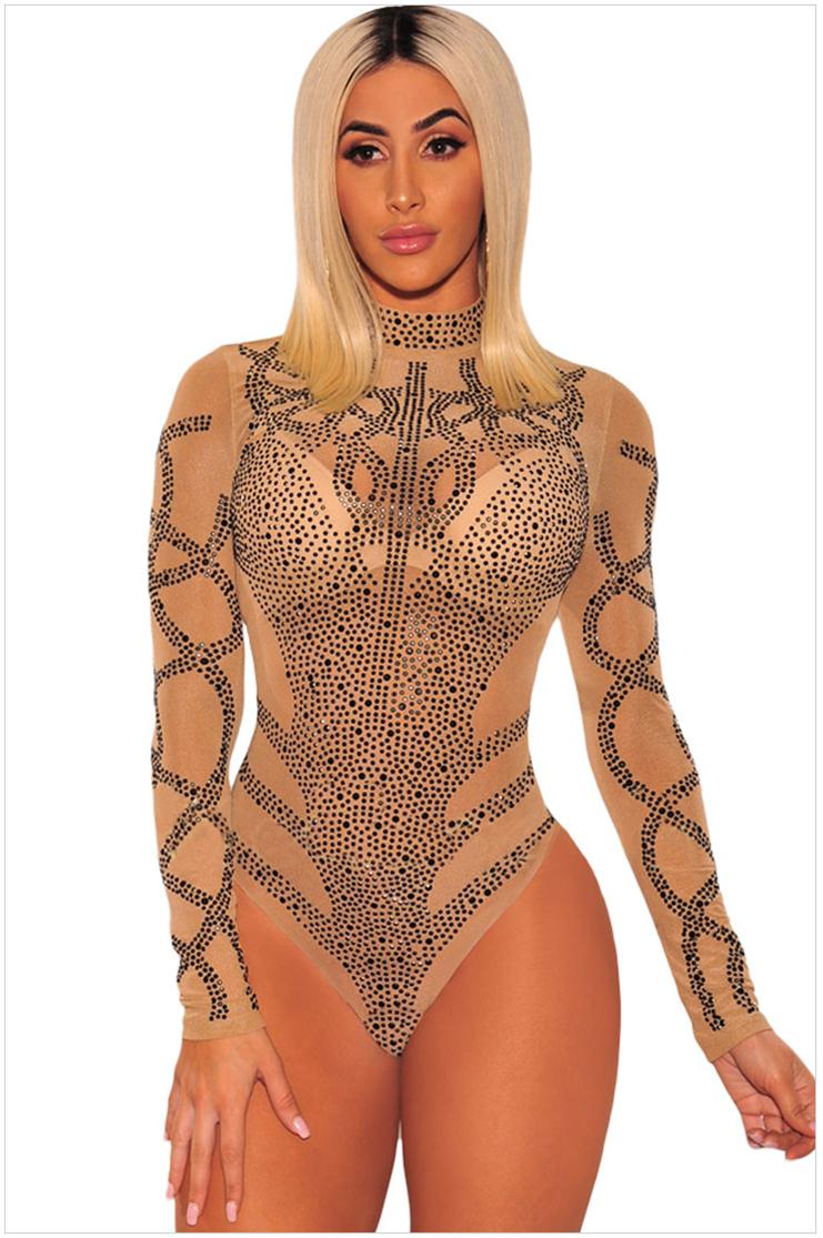 Khaki Long Sleeve O-Neck Rainstones Women Club Tops