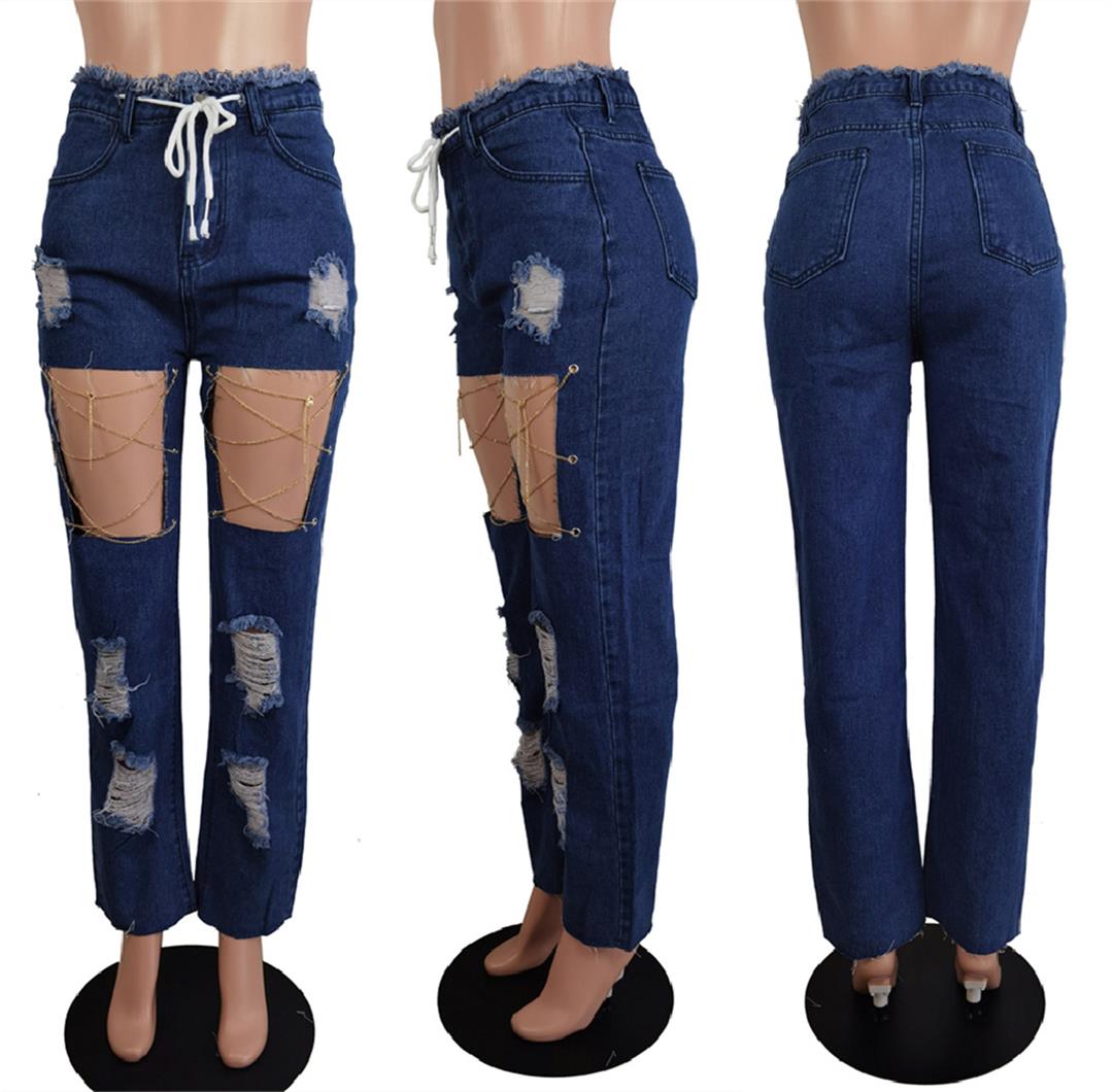 Blue Hollow-out Jeans Chians Pants
