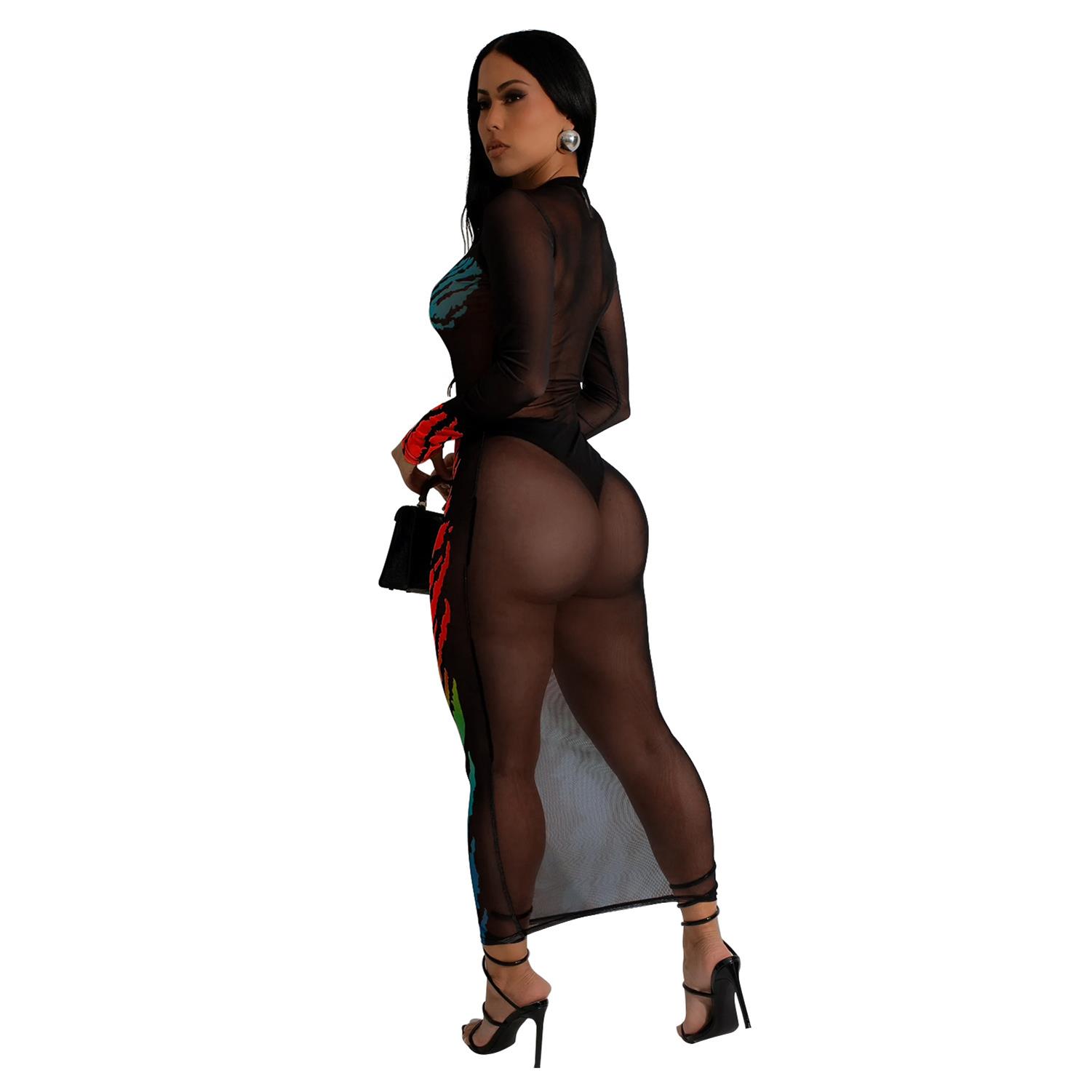 Red Long Sleeve Mesh Printed See Throng Midi Dress