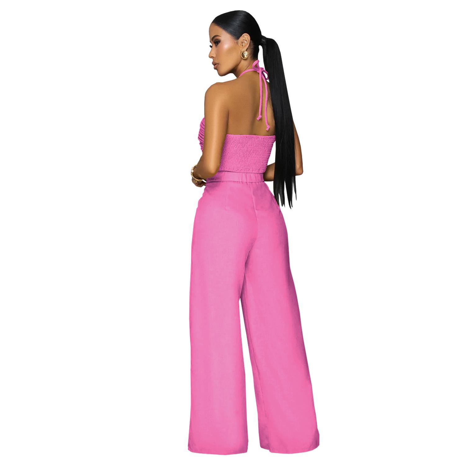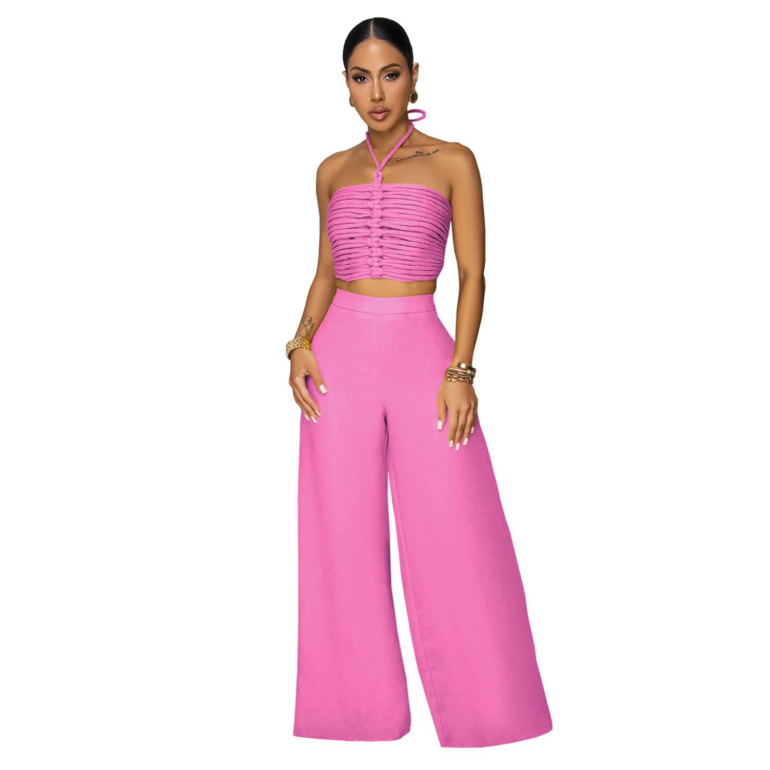 Pink Off Shoulder Halter Neck Lace Up Bandage Two Pieces Pant Sets Wide Leg Dress