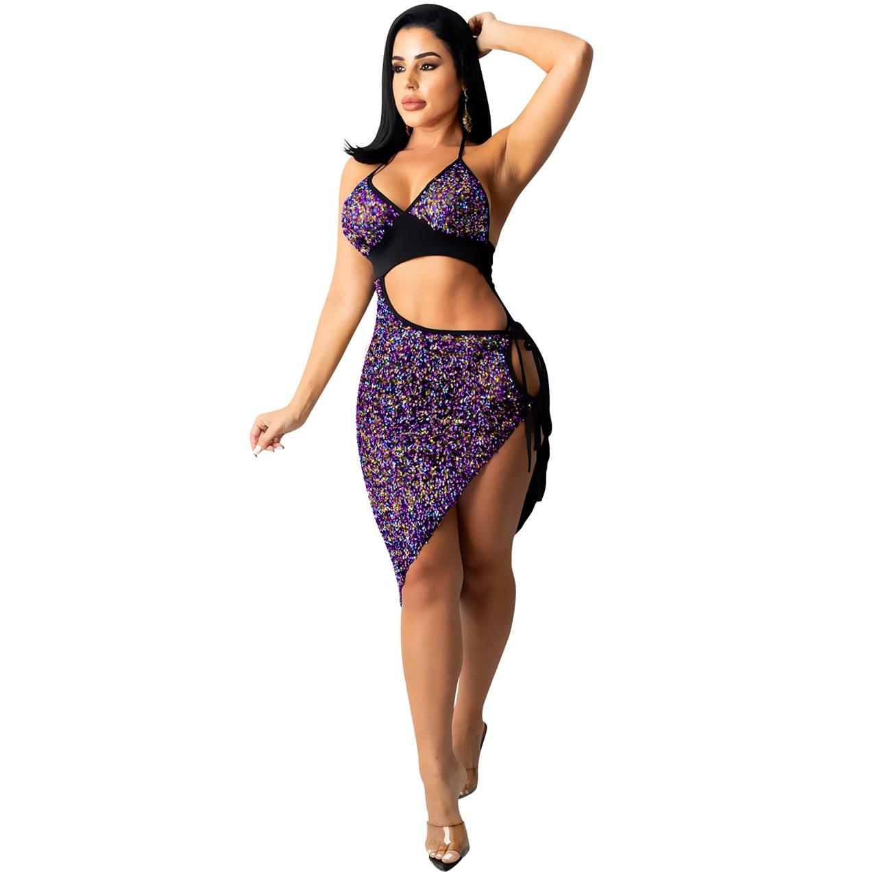 Purple Sleeveless Halter V-Neck Hollow-out Sequins Sexy Party Dress