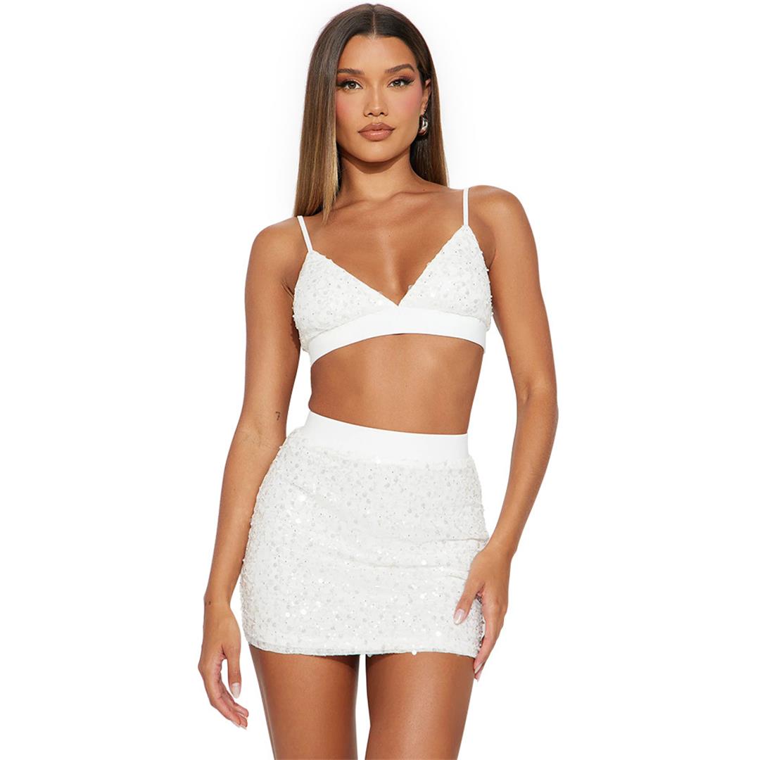 White Sequins Halter V Neck Crop Tops Two Pieces Sexy Short Sets Mini Dress