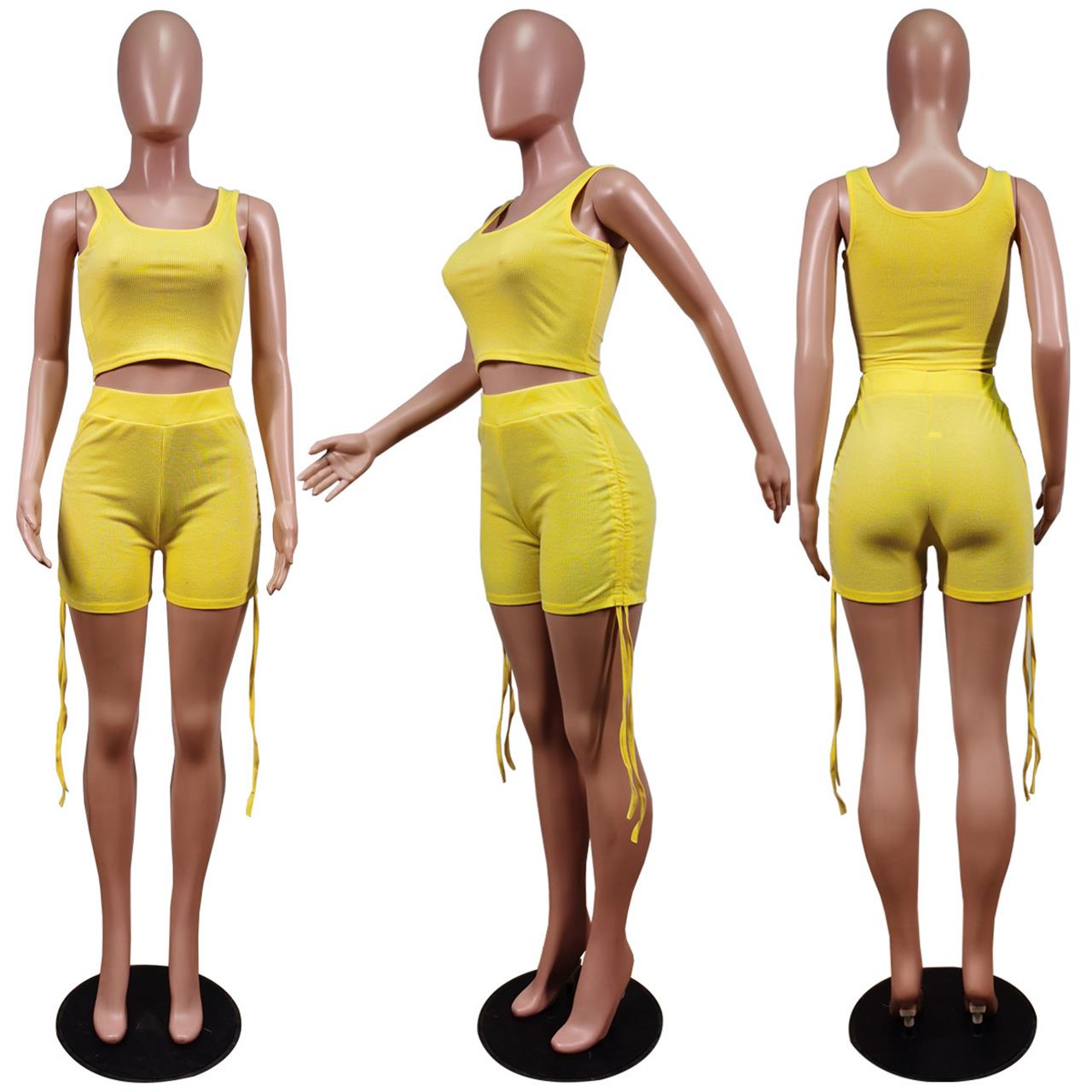 Yellow Sleeveless Cotton Halter Women Short Sets Dress
