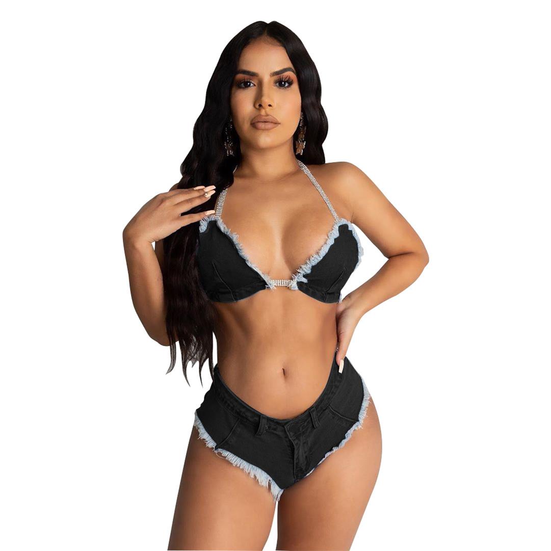 Black Sleeveless Halter V-Neck Jeans Tassels Short Sets