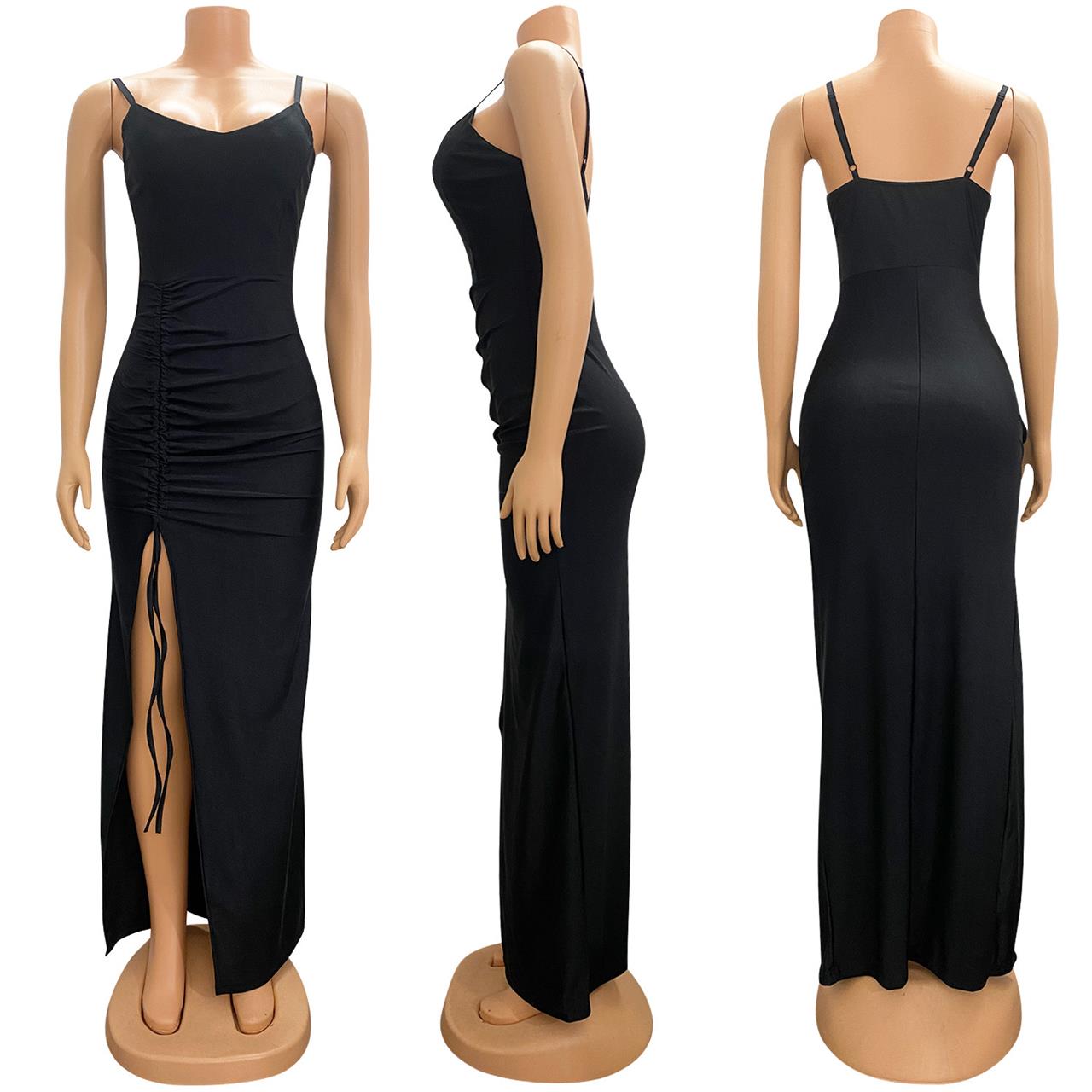 Black Straps Women Low-Cut V-Neck Sexy Pleated Party Prom Bandage Long Dress