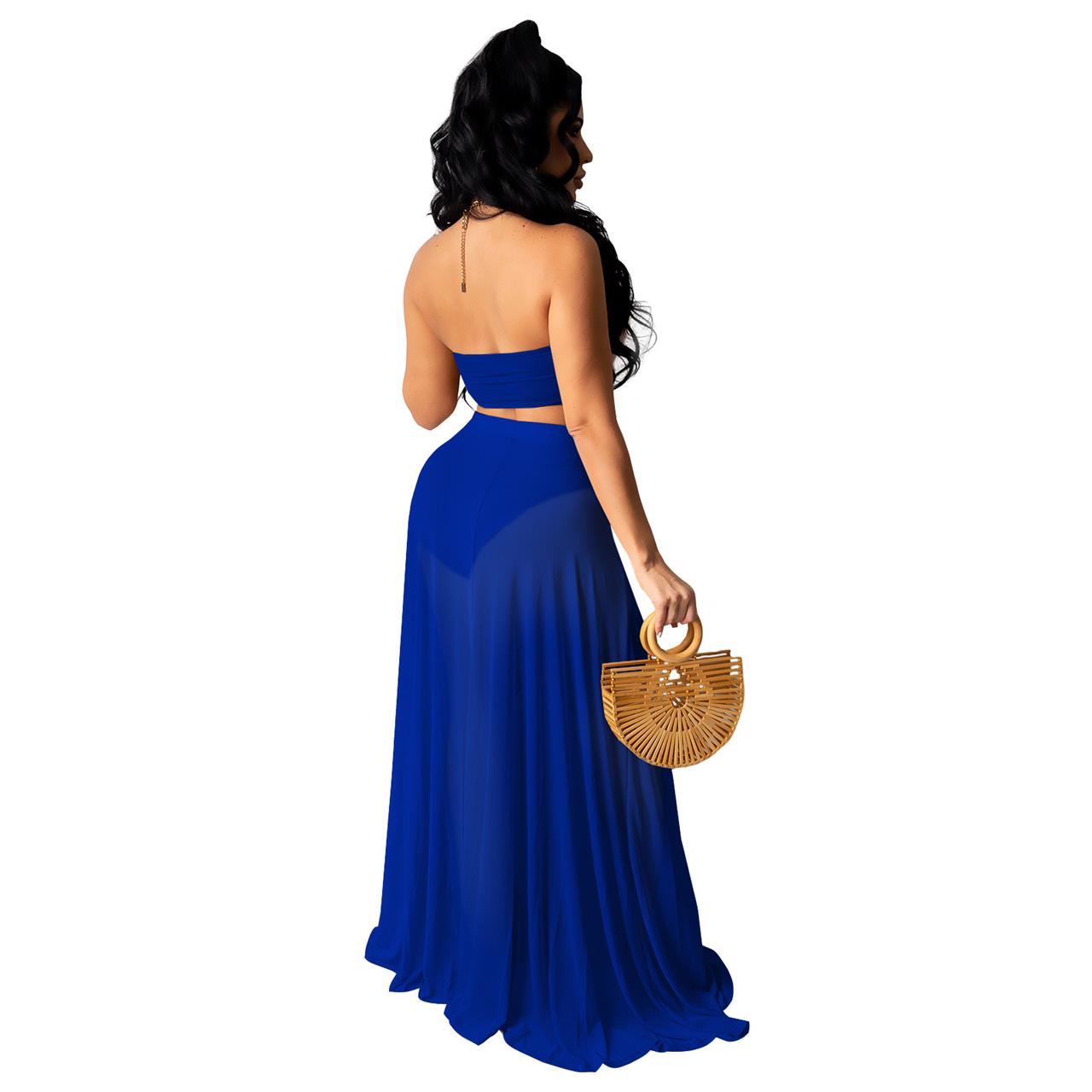 Blue Sleeveless Off-Shoulder Mesh Women Fashion Maxi Dress
