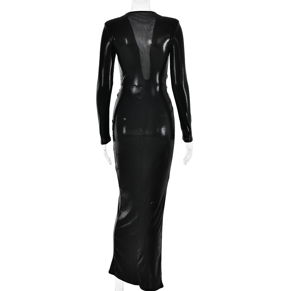 Black Women's Deep V-Neck Long Sleeve Pleated Sexy Evening Prom Maxi Dress