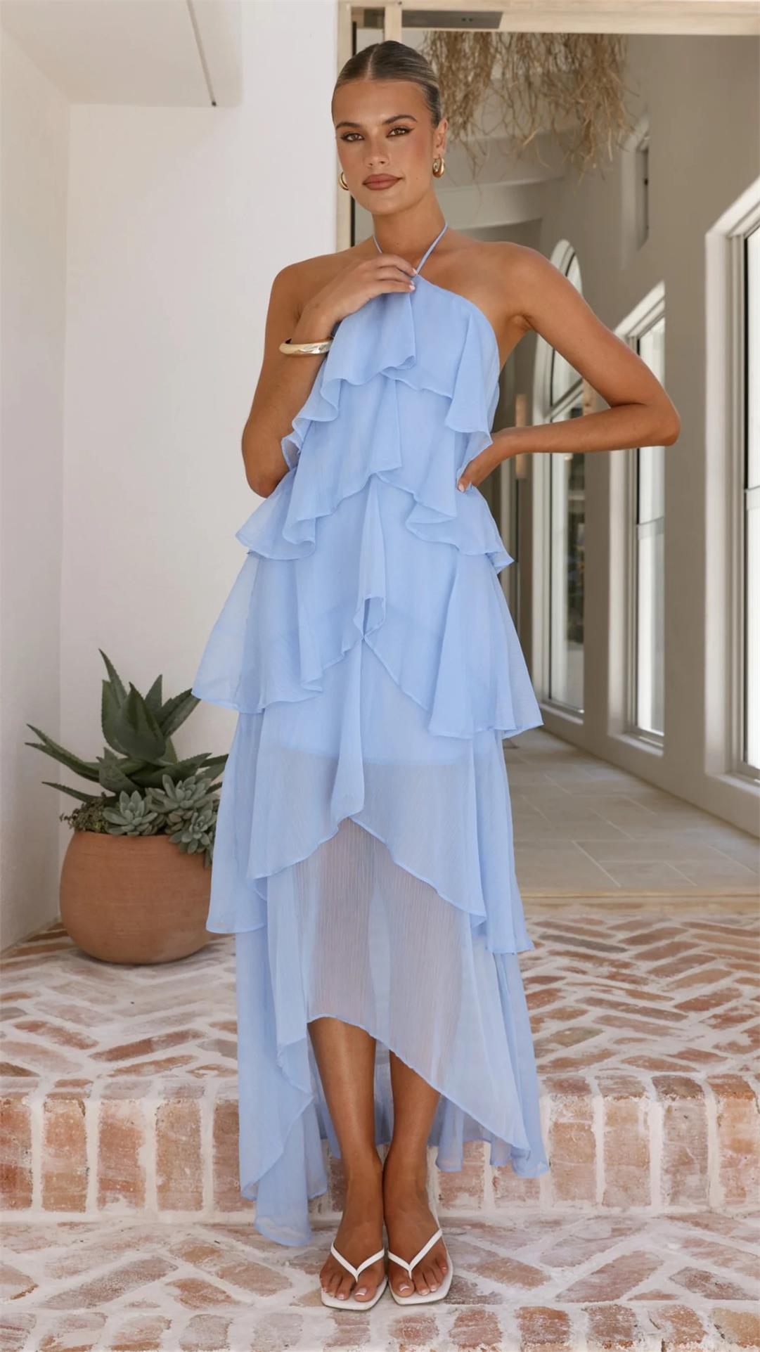 Blue Off Shoulder Halter Neck Mesh Ruffles Women Summer Fashion Long Dress