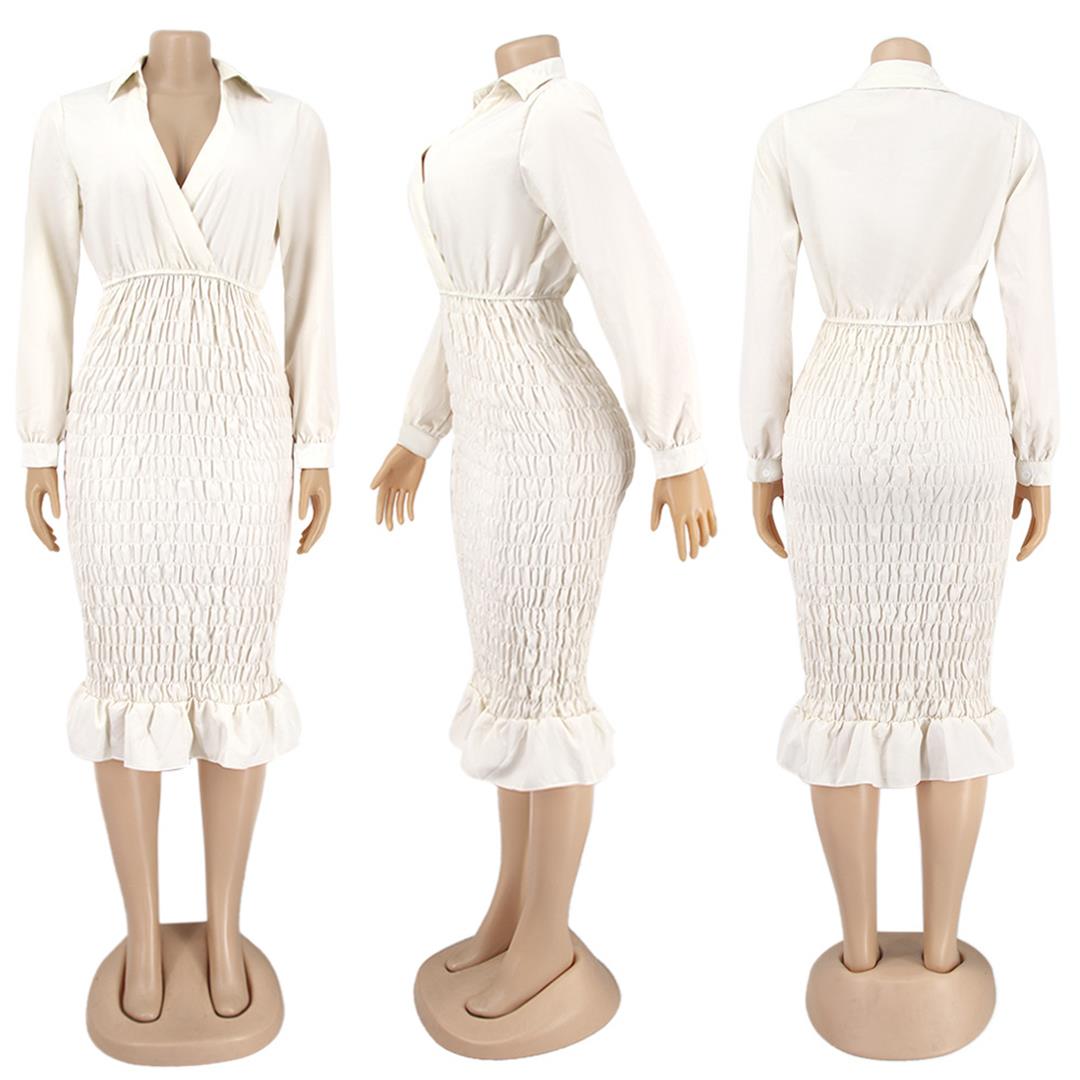 White Long Sleeve Deep V-Neck Women Sexy Midi Dress