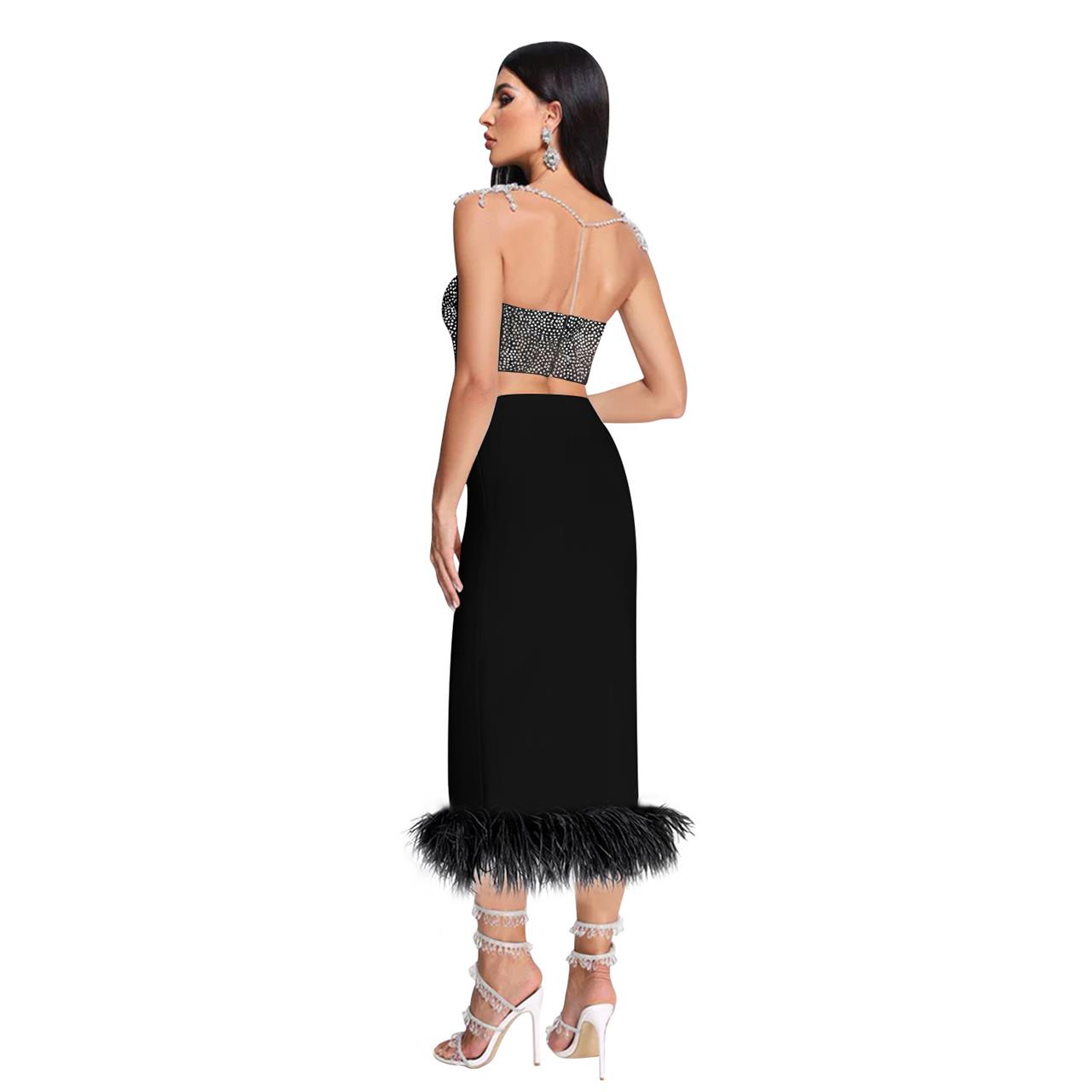 Black Women's Off-Shoulder Diamond Crop Tops Bodycon Feather Midi Dress