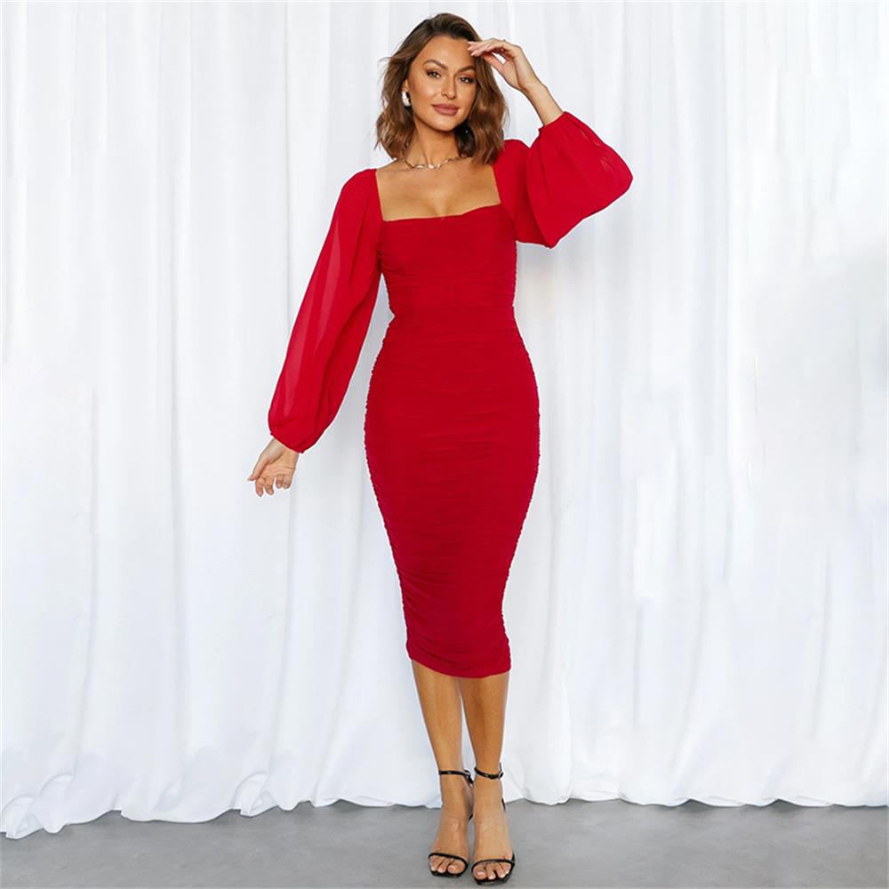 Red Boat-Neck Women Mesh Long Sleeve Pleated Bodycon Midi Prom Dress