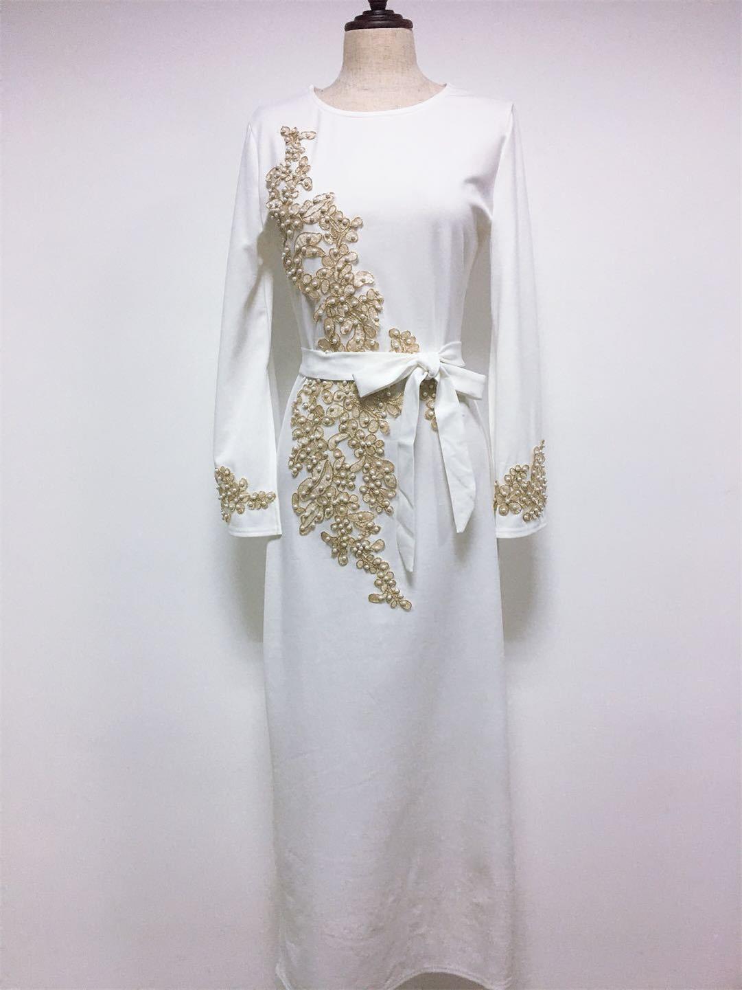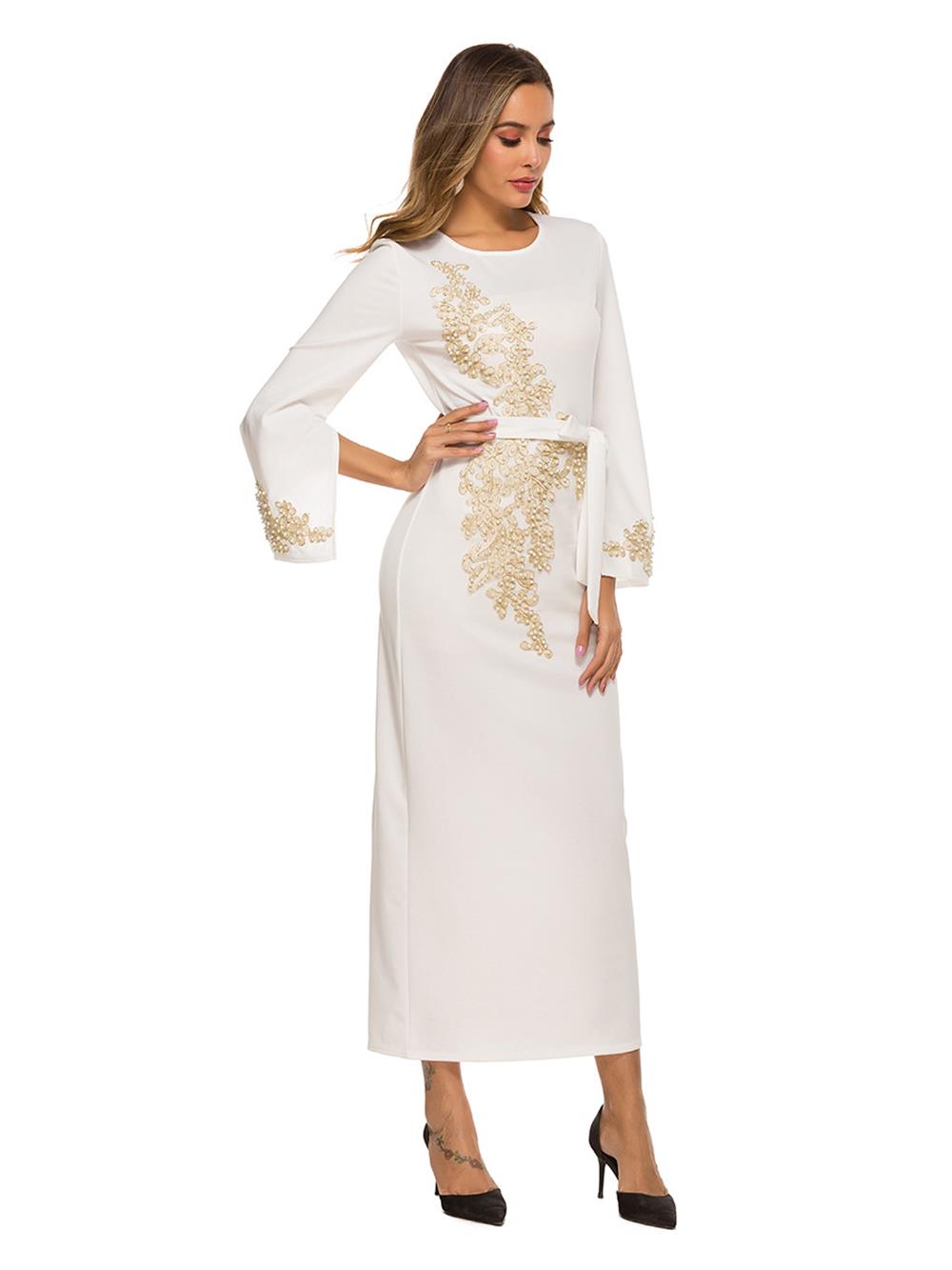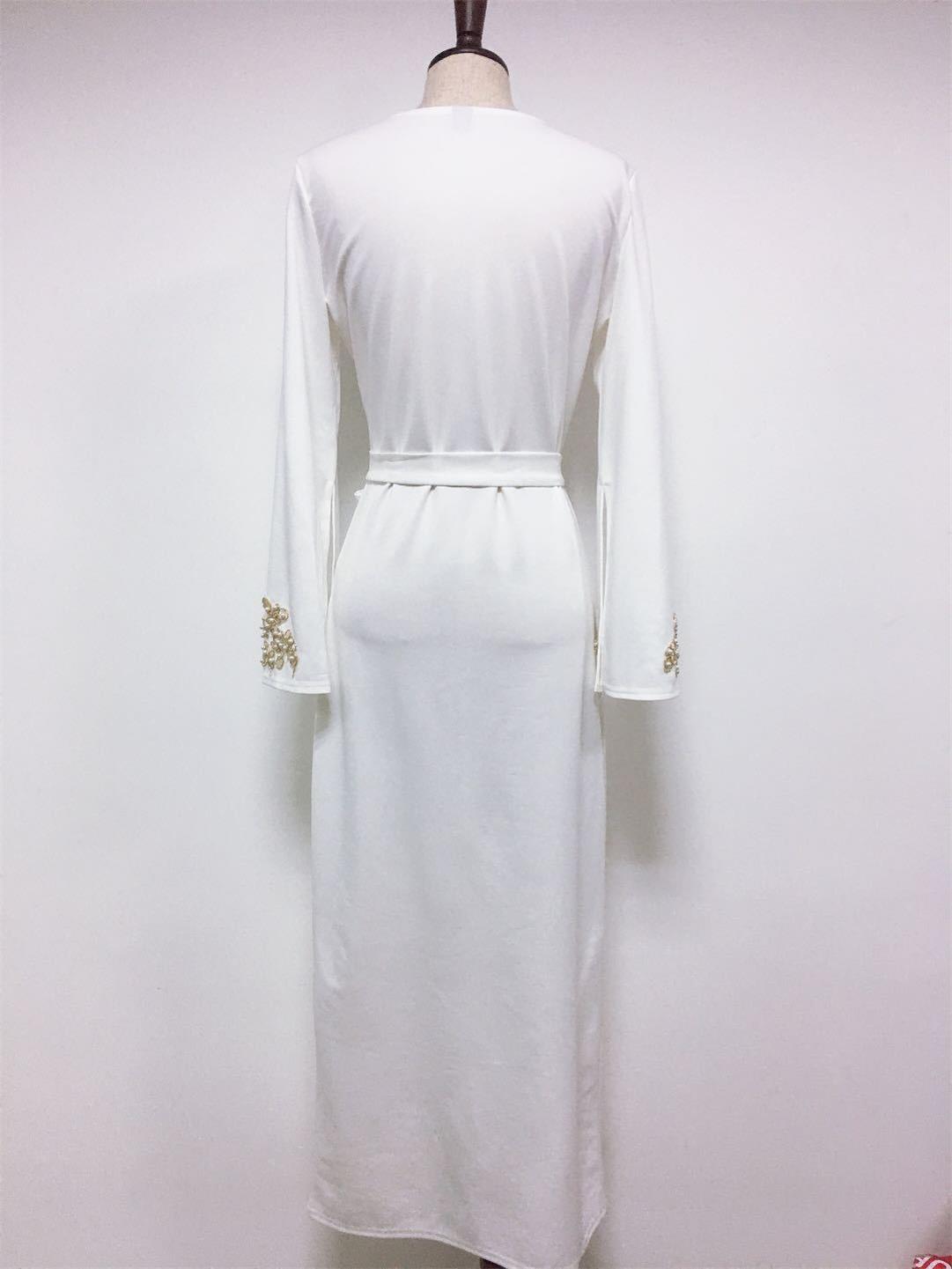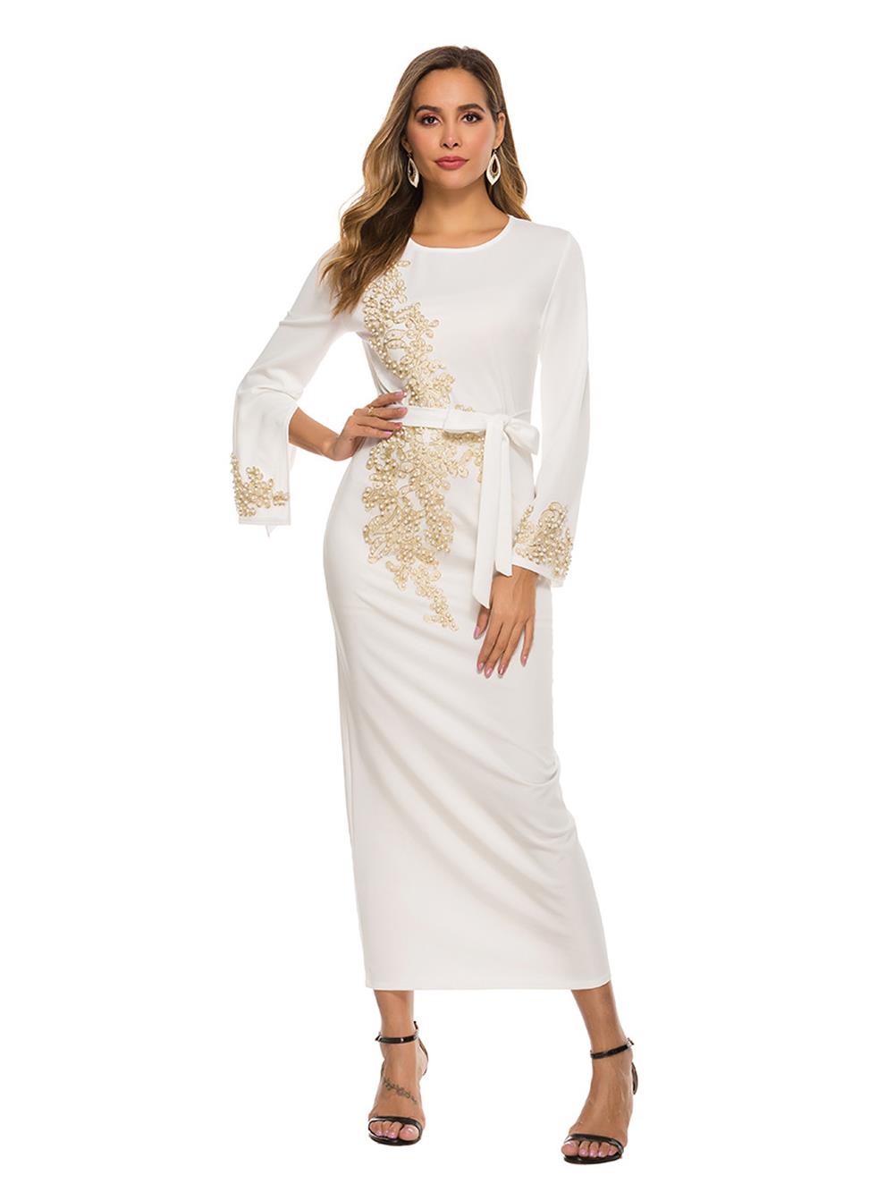 White Long Sleeve Women's Embroid Lace Pearls Belt Fashion Evening Prom Midi Dress