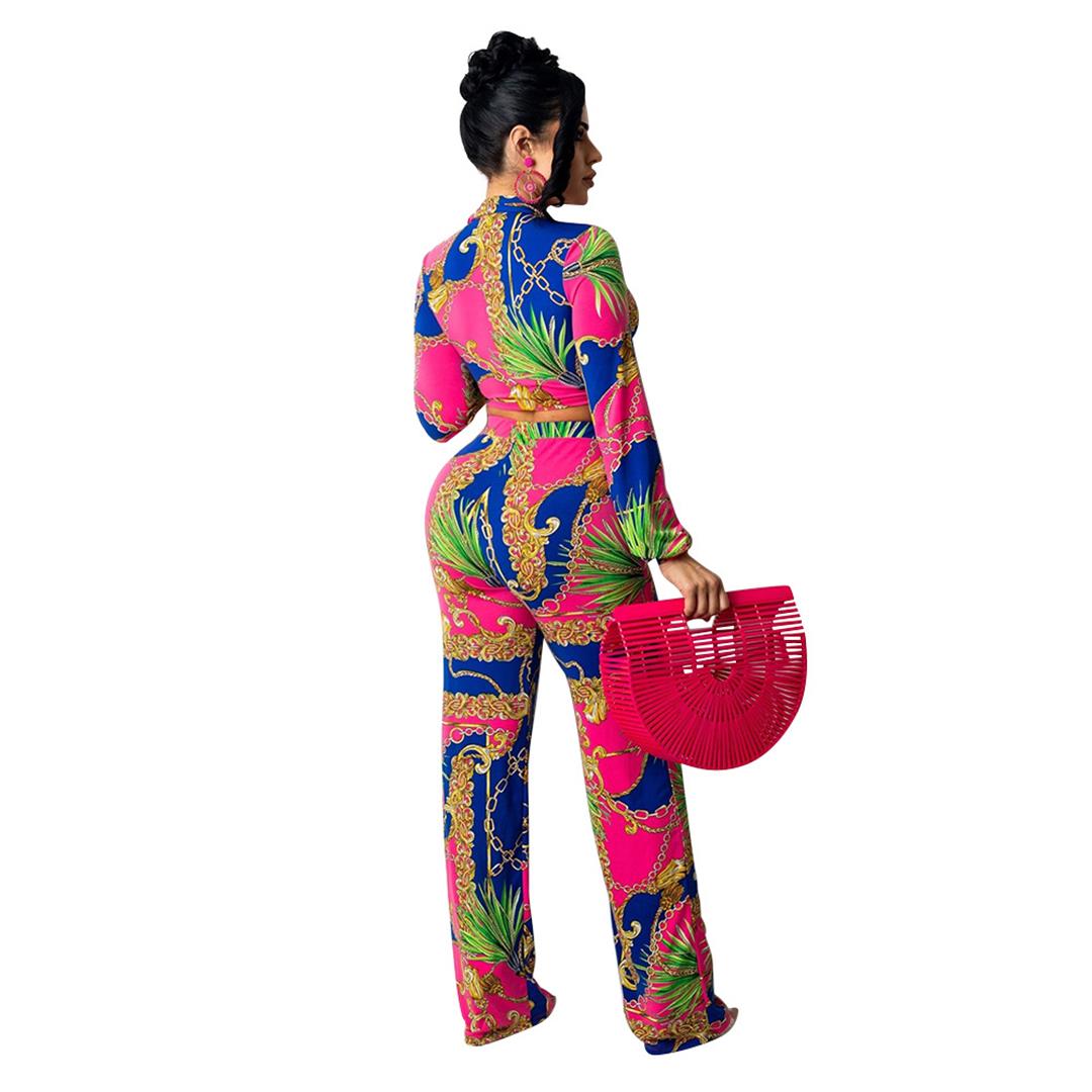 Red Long Sleeve V-Neck Hollow-out Women Printed Jumpsuit