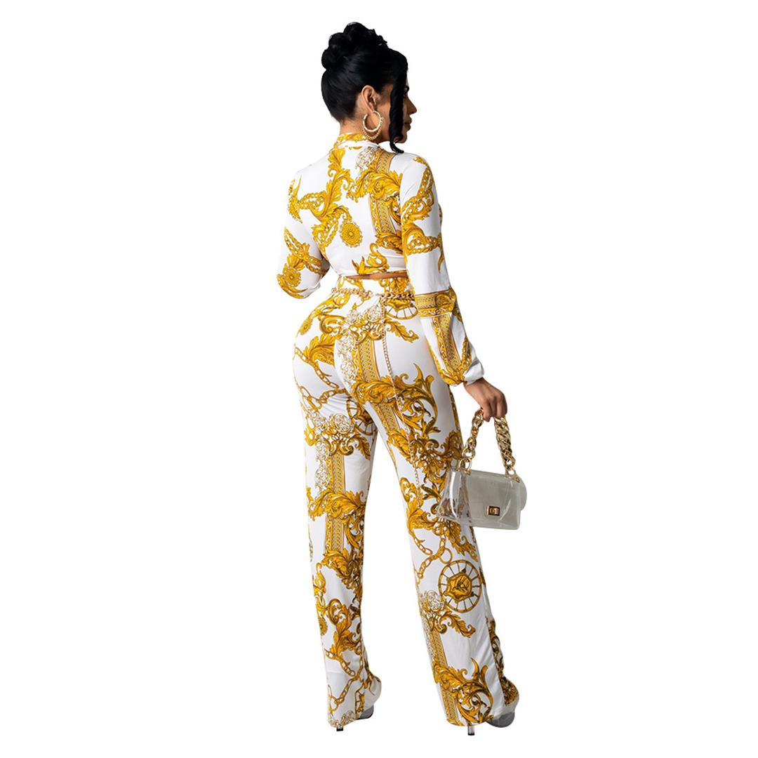 Yellow Long Sleeve V-Neck Hollow-out Women Printed Jumpsuit