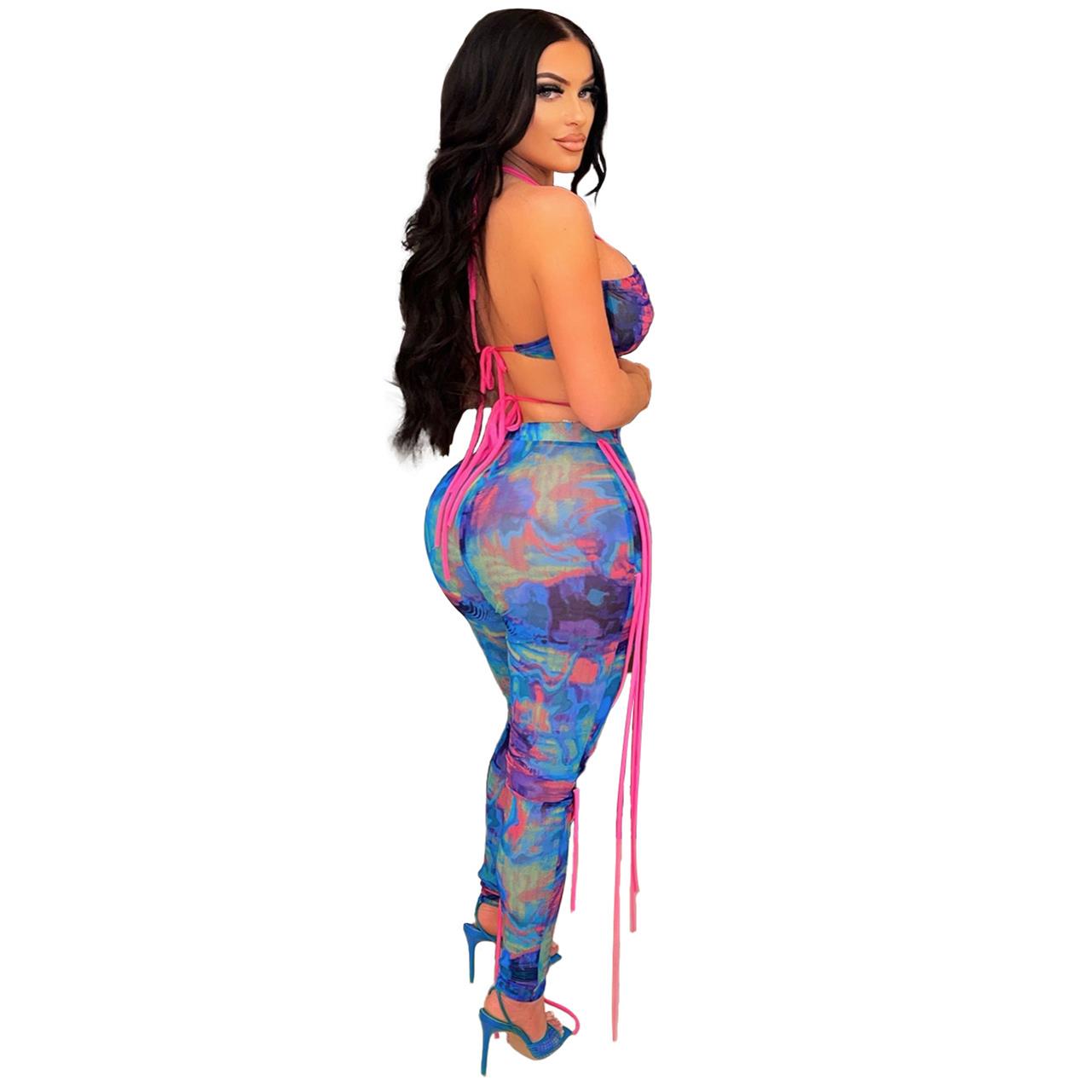 Blue Sleeveless Halter Printed V-Neck Bodycon Women Sexy Jumpsuit