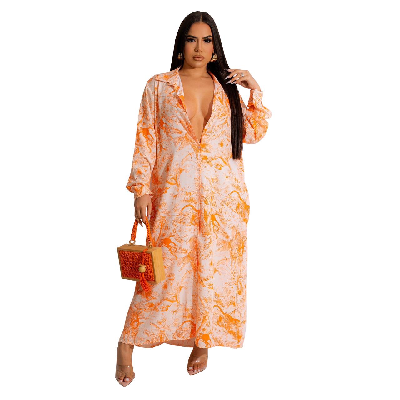 Orange Printed Long Sleeve Button Fashion Women T-Skirt