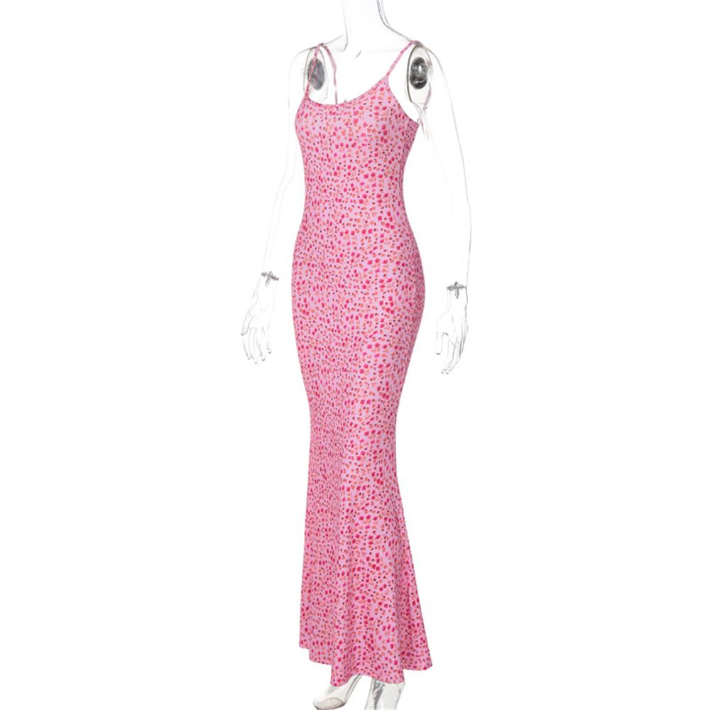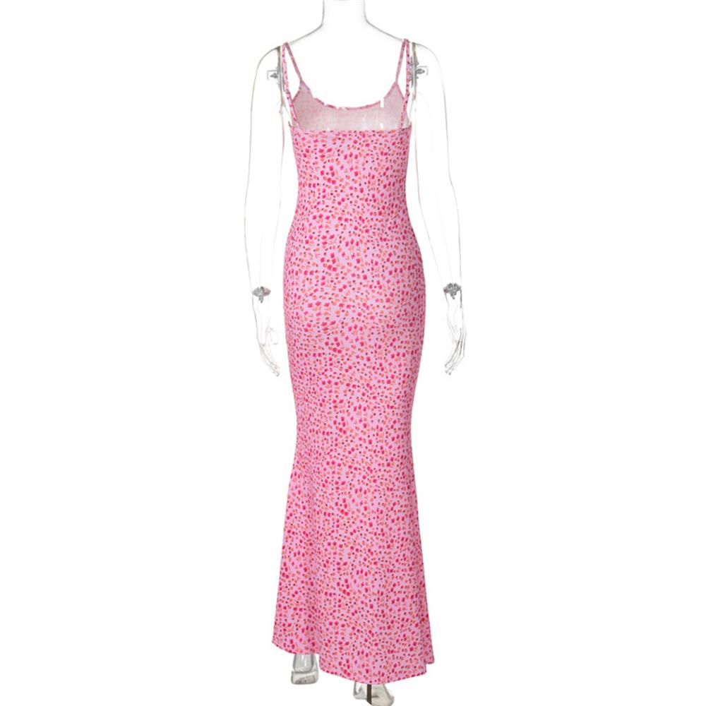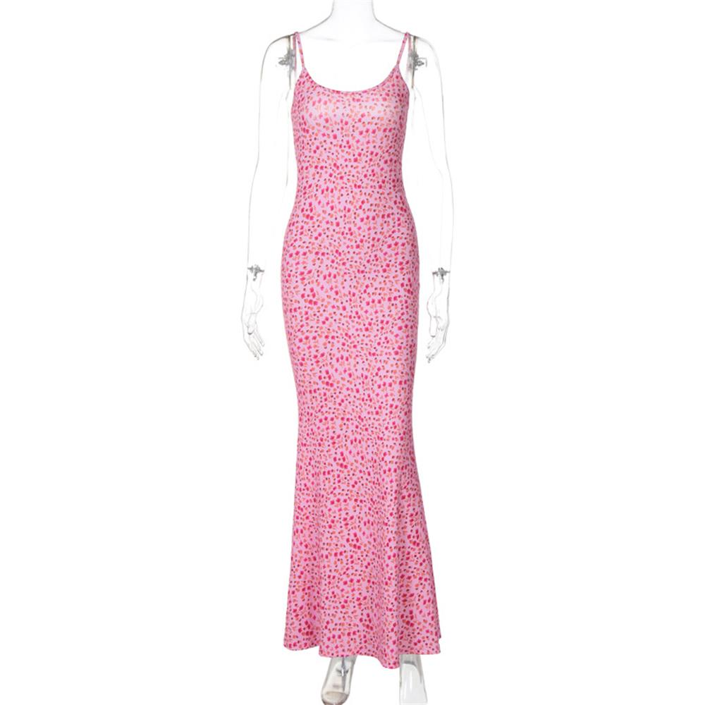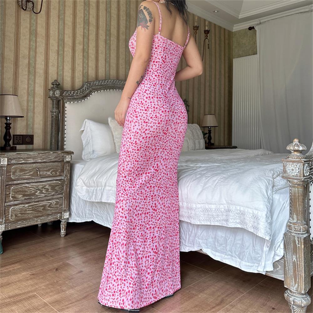 Pink Summer Halter Printed Fresh Floral Slim Fit Suspender Long Dress