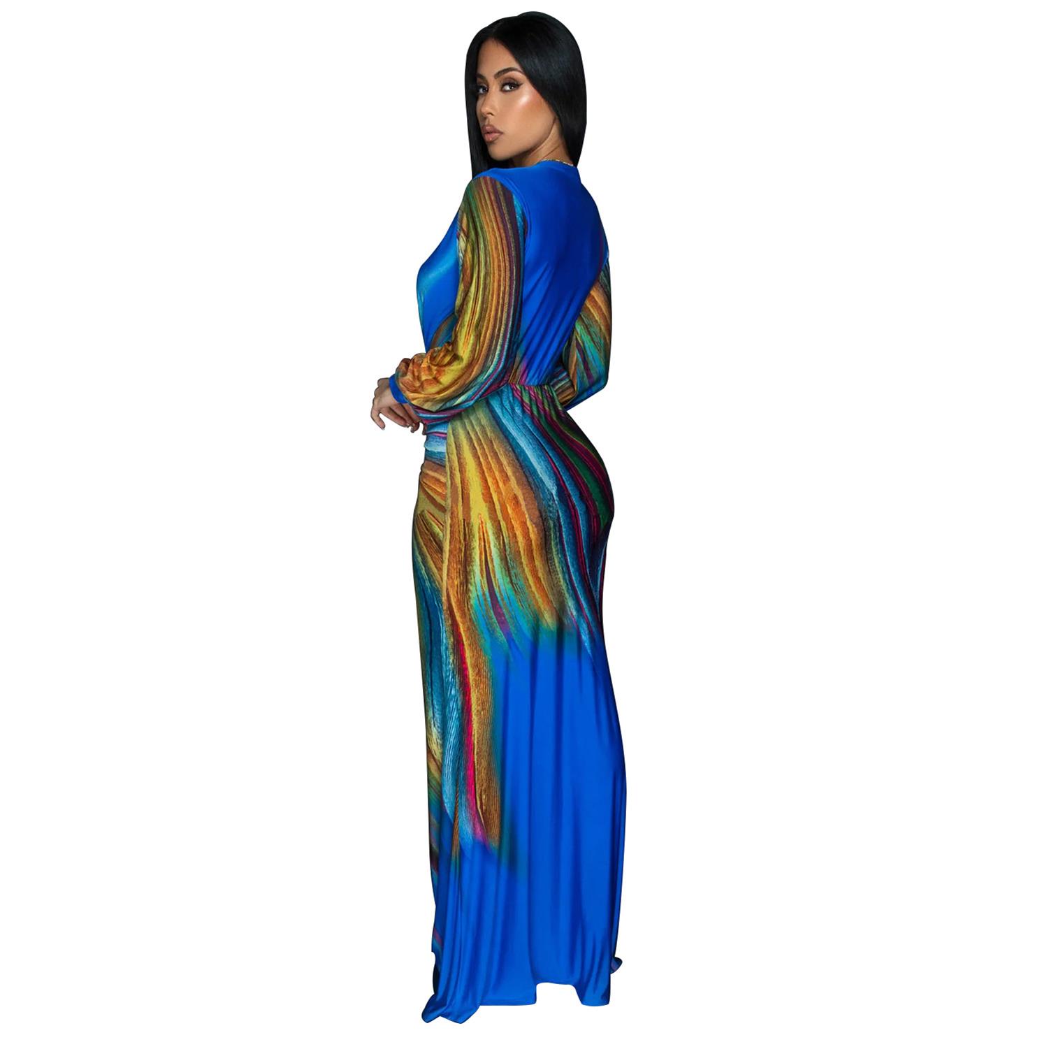 Blue Long Sleeve Deep V Neck Printed Multi Bodycon Pleated Long Dress