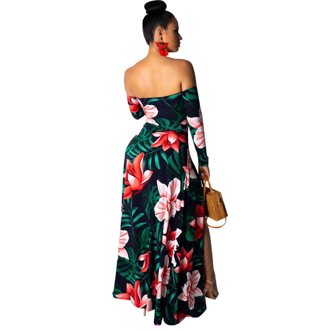 Green Off Shoulder Long Sleeve Printed Hollow Out Floral Long Dress
