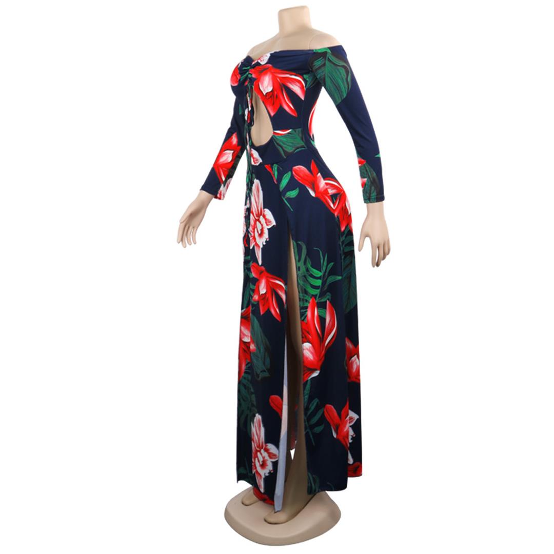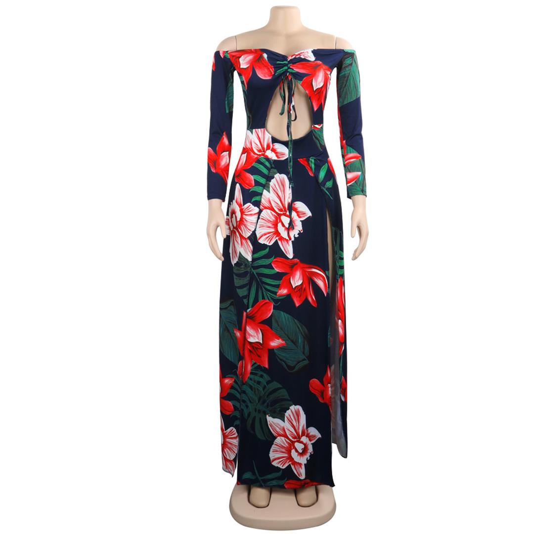 Red Off Shoulder Long Sleeve Printed Hollow Out Floral Long Dress