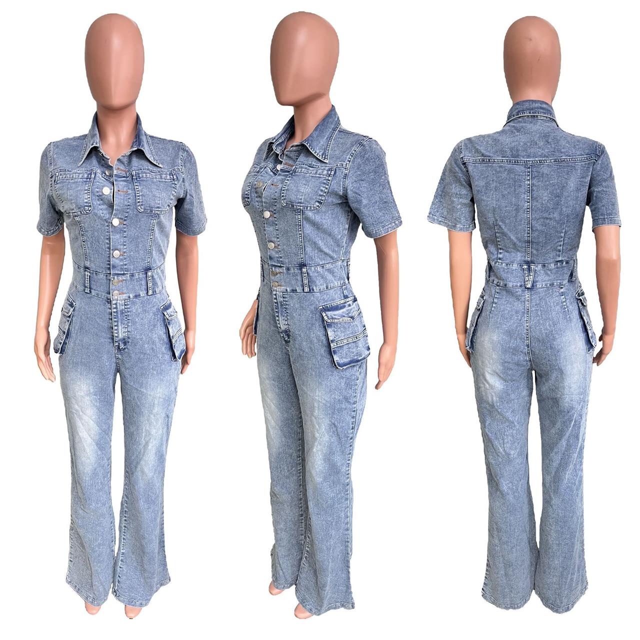 Blue Short Sleeve V-Neck Button Sexy Denim Jeans Bodycon Jumpsuit Dress