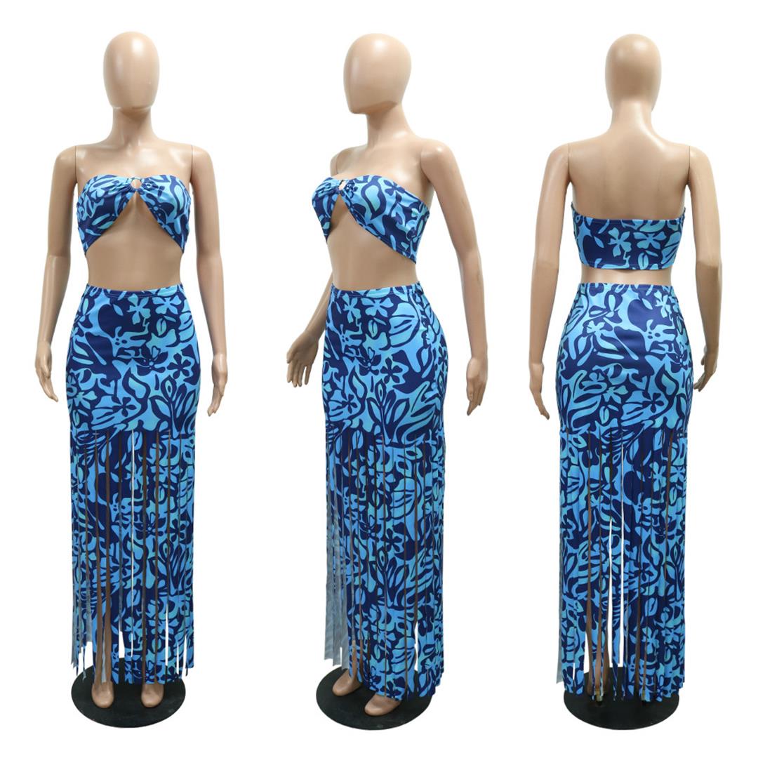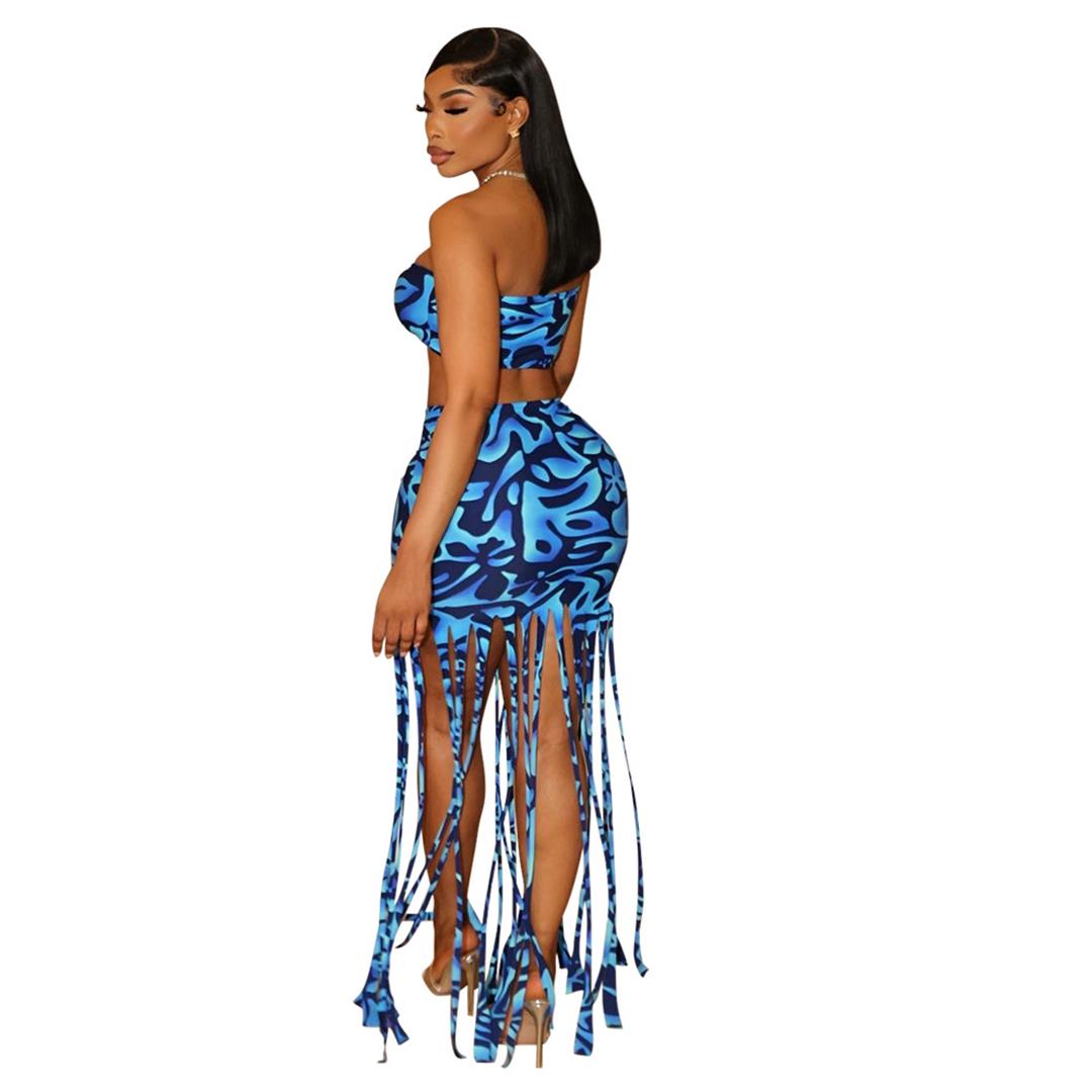 Blue Off Shoulder Sexy Two Pieces Tassels Printed Club Skirt Sets Dress